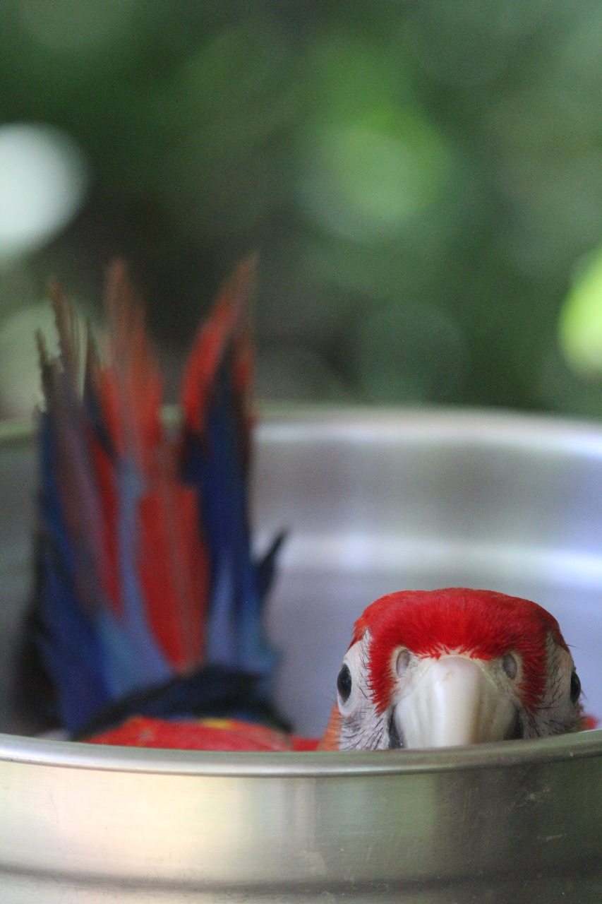 This year, the diets of all birds on site have been modified to provide them with more fat. Articles in the Audubon Society’s journal, The Auk suggest that passerine birds with higher body fat are able to produce more offspring. Additionally, the fruiting season for many fatty food sources (including multiple varieties of palm fruits and nuts) occurs during the macaw’s breeding season. We believed that an increase in dietary fat could stimulate our birds to breed so we began feeding them peanuts three times a week. Though peanuts are a very expensive food item to buy, it seems the cost has produced an exceedingly precious reward. We have also increased the frequency of feeding the parents of young chicks to three times a day to guarantee that the parents always have an abundance of fresh food to feed their young.